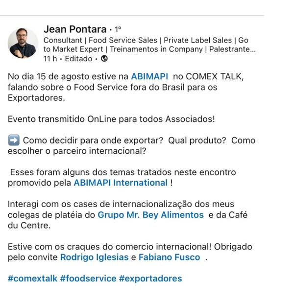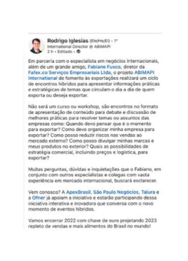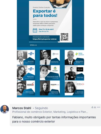 Fafex.co, participou como palestrante dos webinars que foram realizados pelo Sebrae nos dias 17.04 e 19.04.23, compartilhando informações importantes sobre o tema: “Contratos, fechamento de pedidos e negociação internacional”.